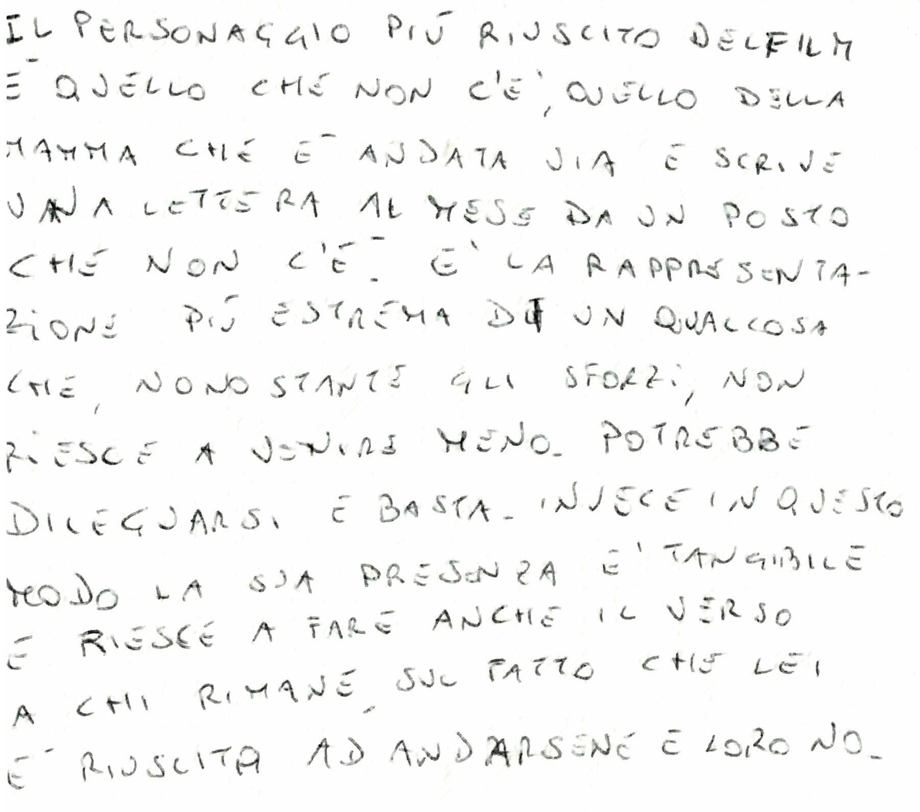 4) Il personaggio più riuscito del film è quello che non c’è, quello della mamma che è andata via e scrive una lettera al mese da un posto che non c’è. È la rappresentazione più estrema di un qualcosa che, nonostante gli sforzi, non riesce a venire meno. Potrebbe dileguarsi e basta. Invece in questo modo la sua presenza è tangibile e riesce a fare anche il verso a chi rimane sul fatto che lei è riuscita ad andarsene e loro no.