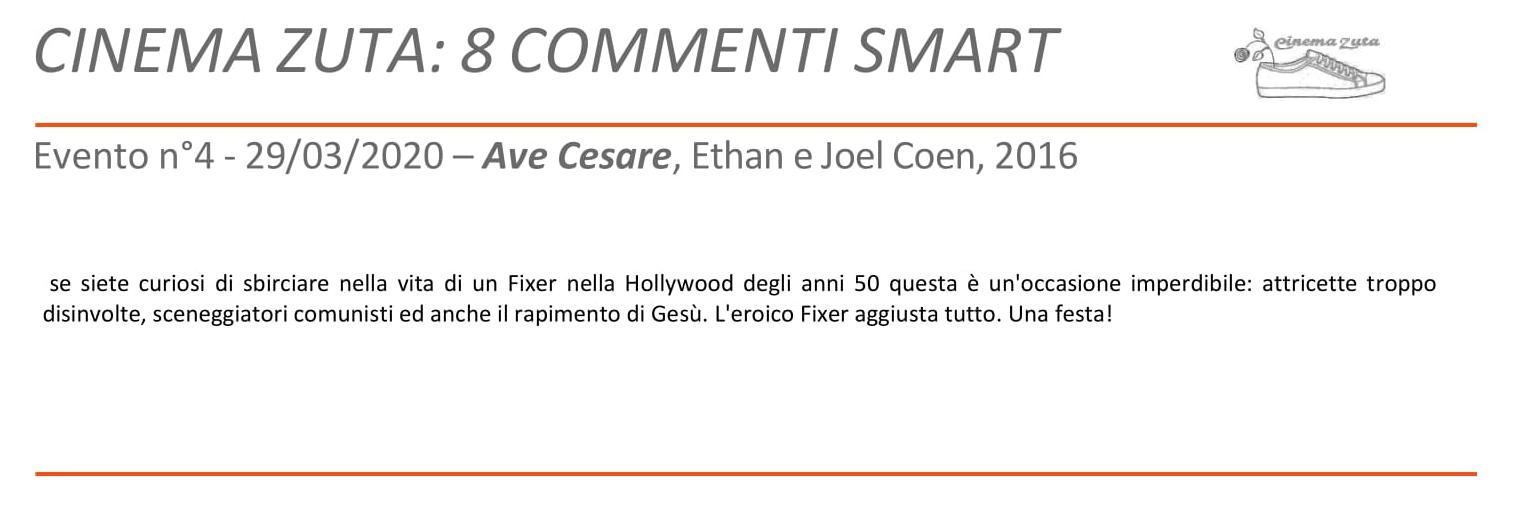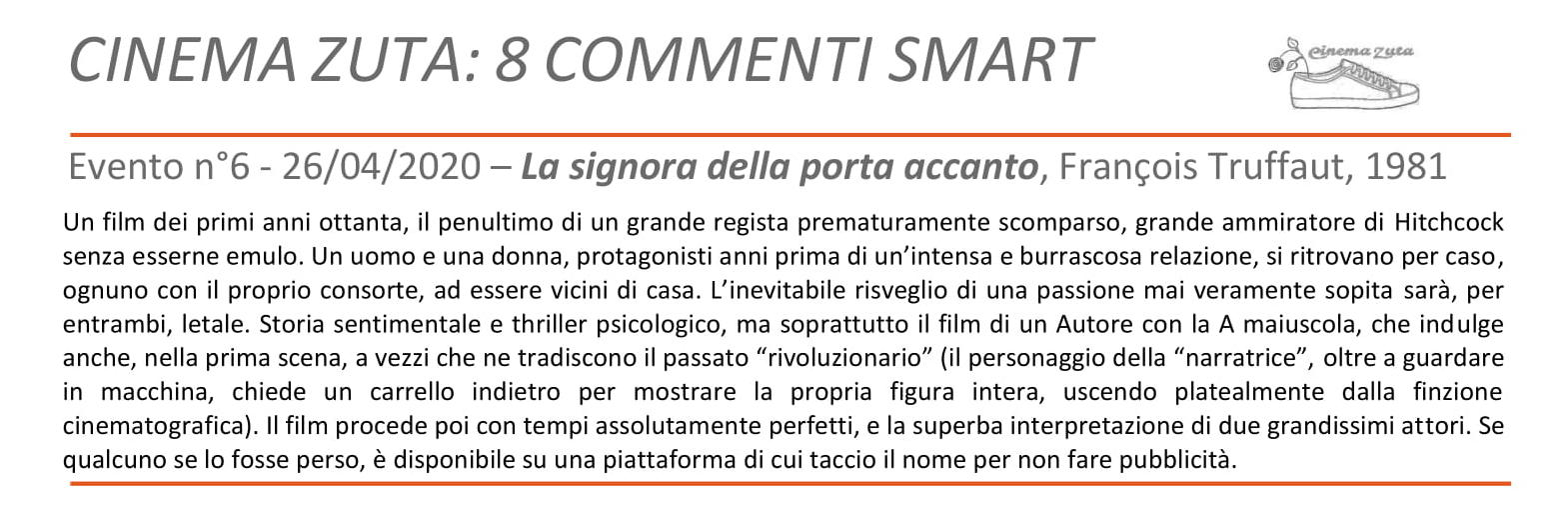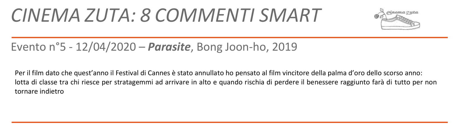 Il Cinema Zuta non si dà per vinto, neanche in tempi bui in cui l'isolamento ci affligge. Ecco il primo evento Smart! Un evento via Skype, organizzato in modo un po' diverso dal solito, ma che ricalca e riprende quasi tutte le usanze tipiche degli altri eventi... compresa la merenda!