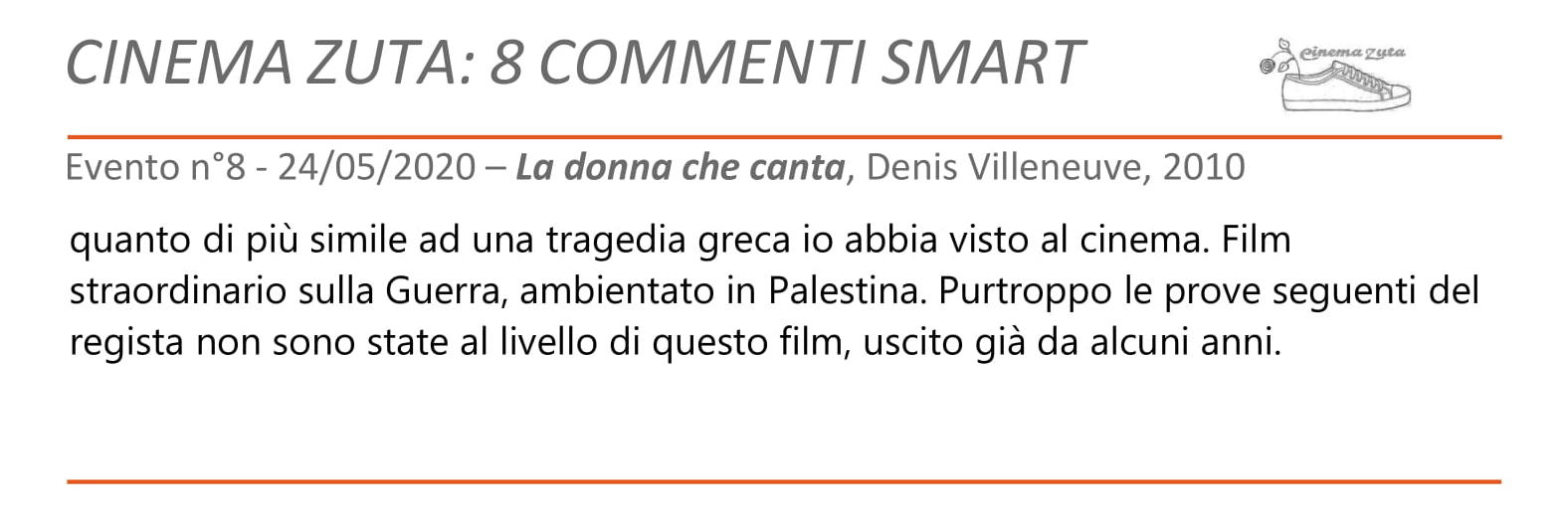 1) (La donna che canta) quanto di più simile ad una tragedia greca io abbia visto al cinema. Film straordinario sulla Guerra, ambientato in Palestina. Purtroppo le prove seguenti del regista non sono state al livello di questo film, uscito già da alcuni anni.